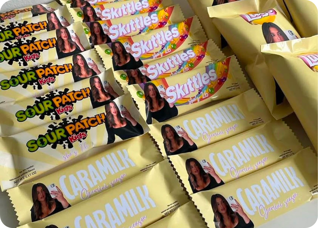 Rends ton événement encore plus WOW! Que ce soit pour un anniversaire, un bachelor(ette), un shower, un mariage ou corporatif, faites personnaliser sacs de chips, barres de chocolat, sacs de bonbons, menthes, ring pop, sacs de popcorn, paquets de gomme, bouteilles d’eau et eau vitaminée à votre image.